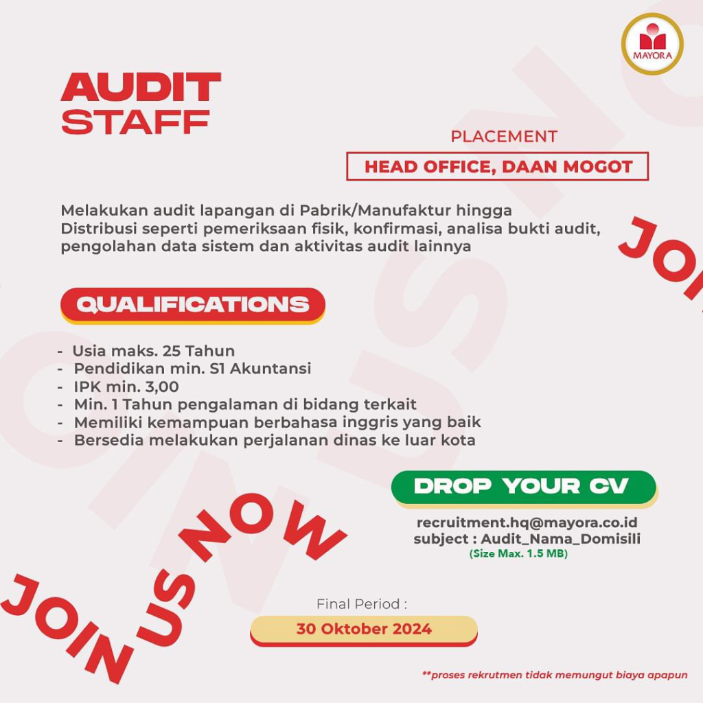Yuk daftar sekarang dan kirimkan CV mu di recruitment.hq@mayora.co.id dengan subject sesuai ketentuannya! Good Luck💪🏻