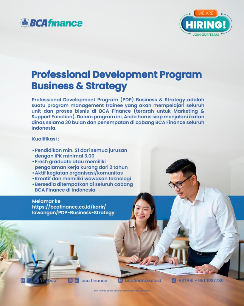 Makassar, EBS FM Unhas — BCA Finance resmi membuka pendaftaran Professional Development Program (PDP) Business & Strategy, sebuah program management trainee yang dirancang untuk mencetak talenta muda dengan pemahaman komprehensif mengenai seluruh unit dan proses bisnis perusahaan, khususnya di bidang Marketing dan Support Function.
