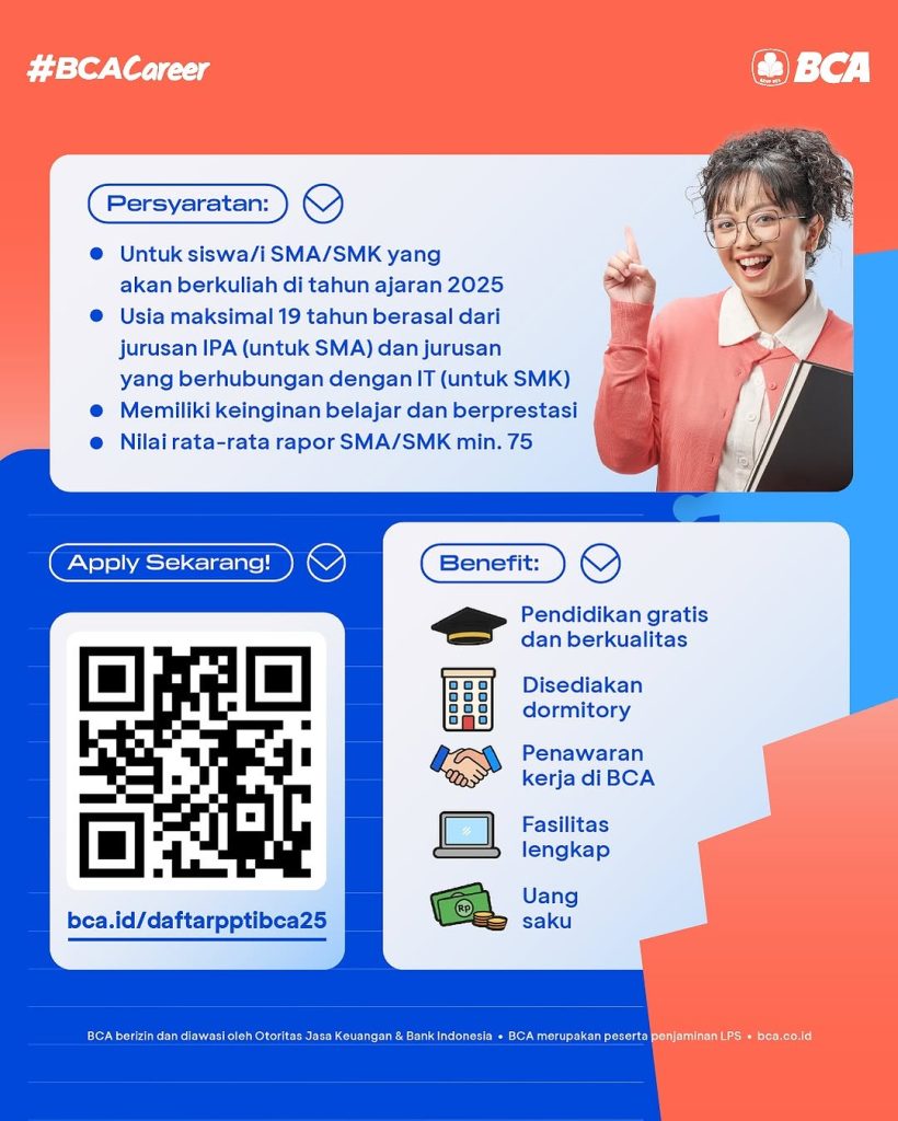 Pendaftaran beasiswa ini hanya sampai tanggal 31 Januari 2025, jadi buat Akademia Makassar yang memenuhi syarat sebagai siswa/i SMA/SMK yang akan lulus tahun 2025 dan berusia maksimal 19 tahun (jurusan IPA untuk SMA / jurusan terkait IT untuk SMK) dengan nilai rata-rata rapor min. 75 dan sudah tidak sabar mendapatkan beasiswa dengan segudang manfaat boleh langsung mendaftar di link berikut ya https://bca.id/daftarpptibca