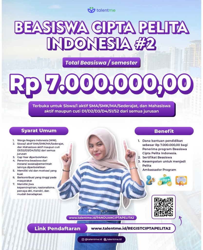 Untuk informasi lebih lanjut, hubungi admin di WhatsApp: 0851-7512-6976. Segera daftar dan jadilah bagian dari Beasiswa Cipta Pelita Indonesia #2