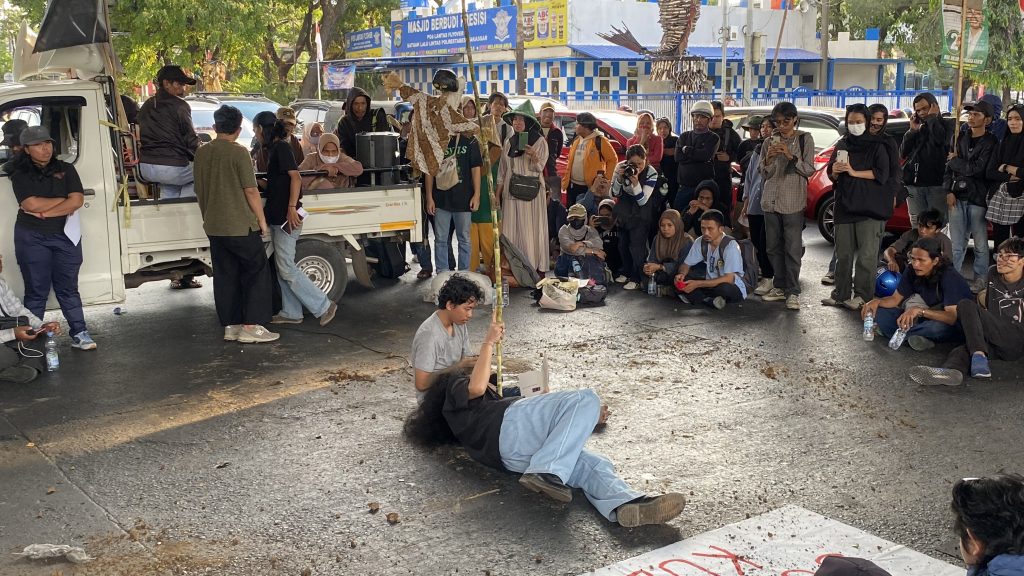 Makassar, EBS FM Unhas — Aliansi demonstran dalam memperingati hari tani nasional hari ini di flyover Pettarani, menggelar beberapa bentuk aksi salah satunya yaitu dalam bentuk seni teater. Bentuk lain dari unjuk rasa ini ditampilkan oleh salah satu demonstran, Selasa (24/9).