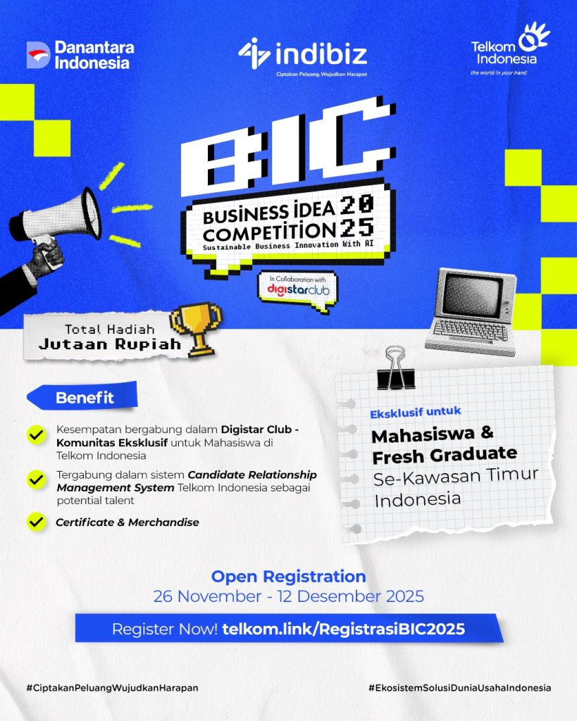 Makassar, EBS FM Unhas — Indibiz KTI kembali menghadirkan Business Idea Competition (BIC) 2025, sebuah kompetisi ide bisnis yang ditujukan bagi mahasiswa dan fresh graduate di Kawasan Timur Indonesia. Tahun ini, BIC mengusung tema Sustainable Innovation with AI, membuka ruang bagi gagasan yang tidak hanya bernilai ekonomi, tetapi juga berdampak sosial dan ramah lingkungan melalui pemanfaatan teknologi Artificial Intelligence.