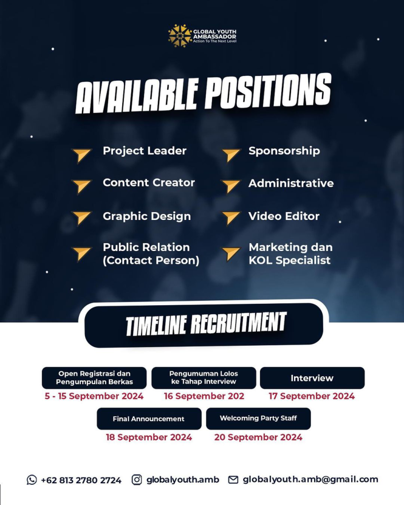 Open Recruitment GYA Team 2024 membuka berbagai posisi menarik untuk para pelamar, di antaranya Project Leader, Content Creator, Sponsorship, Administrative, Graphic Designer, Video Editor, Public Relation (Contact Person), serta Marketing dan KOL Specialist. Posisi-posisi ini memberikan kesempatan kepada peserta untuk terlibat aktif dalam program-program GYA, sekaligus mengasah keterampilan mereka dalam lingkungan yang dinamis dan beragam. Bagi yang berminat, dapat mendaftar melalui link pendaftaran yang tersedia.