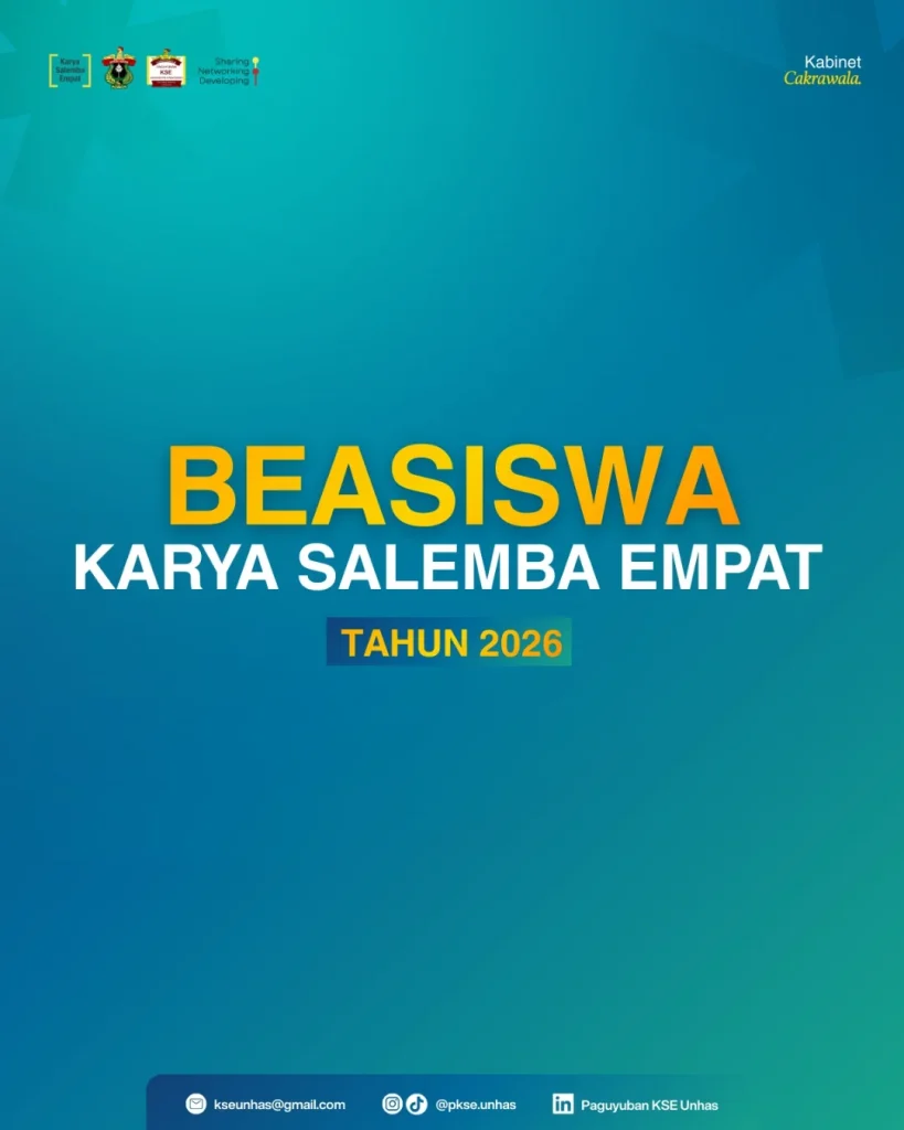 Makassar, EBS FM Unhas β€” Pendaftaran Beasiswa Karya Salemba Empat (KSE) 2026 resmi diperpanjang hingga 19 April 2026 yang memberikan kesempatan lebih luas bagi mahasiswa untuk melengkapi berkas dan mengikuti seluruh tahapan seleksi. Beasiswa ini merupakan program dukungan pendidikan bagi mahasiswa S1 yang tidak hanya berfokus pada bantuan finansial, tetapi juga pengembangan diri melalui pembinaan, jejaring, serta kontribusi aktif dalam kegiatan sosial bersama Paguyuban KSE.