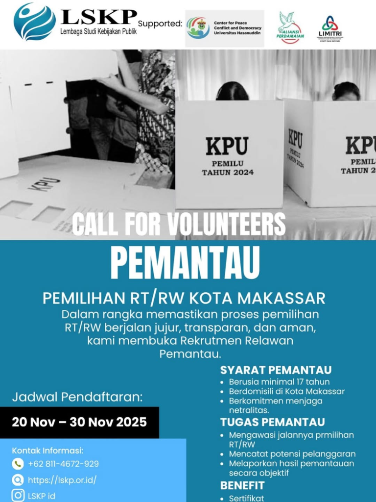 Makassar, EBS FM Unhas — Lembaga Studi Kebijakan Publik (LSKP) resmi membuka penerimaan Relawan Pemantau Pemilihan RT/RW Kota Makassar. Program ini hadir sebagai upaya memastikan proses pemilihan di tingkat akar rumput berjalan jujur, transparan, independen, dan aman demi terwujudnya tata kelola pemerintahan yang lebih baik.