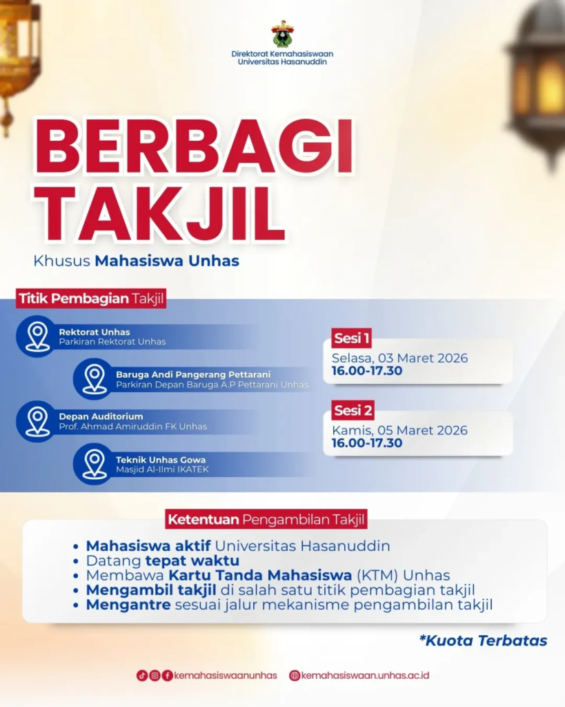 Makassar, EBS FM Unhas – Direktorat Kemahasiswaan Universitas Hasanuddin (Unhas) menggelar program berbagi takjil khusus bagi mahasiswa Unhas dalam rangka menyemarakkan bulan Ramadan 2026. Kegiatan ini akan dilaksanakan dalam dua sesi, yakni Selasa (3/2) dan Kamis (5/2) pukul 16.00 hingga 17.30 Wita, dengan sejumlah titik pembagian di lingkungan kampus.