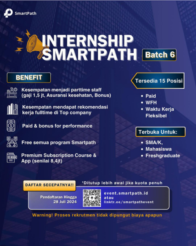Jangan lewatkan kesempatan ini untuk memperkaya pengalaman dan membangun kariermu di industri yang berkembang pesat. Kunjungi https://event.smartpath.id/ atau https://linktr.ee/smartpathevent untuk informasi lebih lanjut dan panduan pendaftaran.