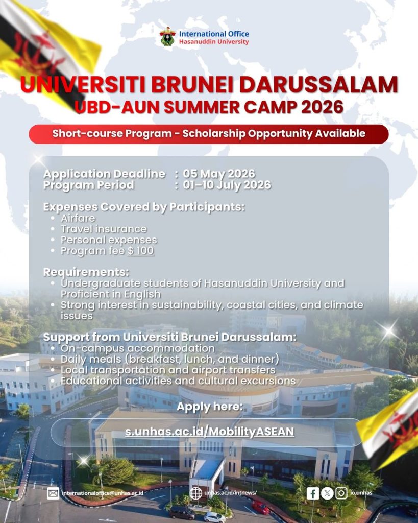 Makassar, EBS FM Unhas – International Office Universitas Hasanuddin (Unhas) membuka kesempatan bagi mahasiswa Unhas untuk mengikuti program internasional UBD-AUN Summer Camp 2026 yang diselenggarakan oleh Universiti Brunei Darussalam bekerja sama dengan ASEAN University Network (AUN). Program ini merupakan kegiatan tahunan yang mempertemukan mahasiswa dari berbagai negara ASEAN untuk mengikuti pembelajaran multidisipliner, pertukaran budaya, serta kegiatan lapangan yang berfokus pada isu-isu Sustainable Development Goals (SDGs).