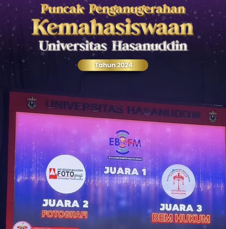 Makassar, EBS FM Unhas — Unit Kegiatan Mahasiswa (UKM) Radio Kampus EBS FM Universitas Hasanuddin (Unhas) berhasil merebut piala di dua kategori pada Puncak Anugerah Kemahasiswaan Unhas. Acara ini digelar di Baruga A.P. Pettarani, Jumat (6/12).