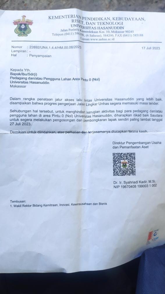 Akademia Makassar, Universitas Hasanuddin memberikan surat ke Para Pedagang kaki lima di sepanjang area pintu 0 (Nol), lewat surat nomor 22692/UN4.1.4/HM.00.06/2023 yang ditandatangani Direktur Pengembangan Usaha dan Pemanfaatan Aset (PUPA), Syahriadi Kadir.